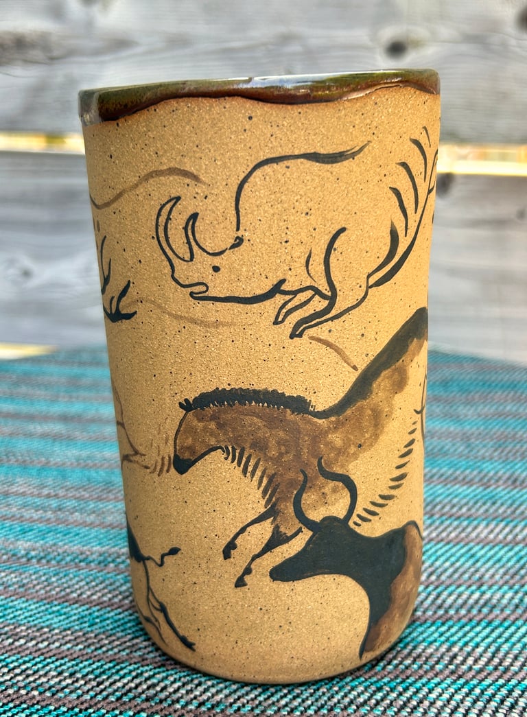 A handbuilt cup made from brown speckle stoneware, inspired by ancient European cave art. The mug is glazed on the inside and unglazed on the outside, giving the surface a feeling similar to smooth river-tumbled rock.