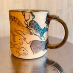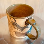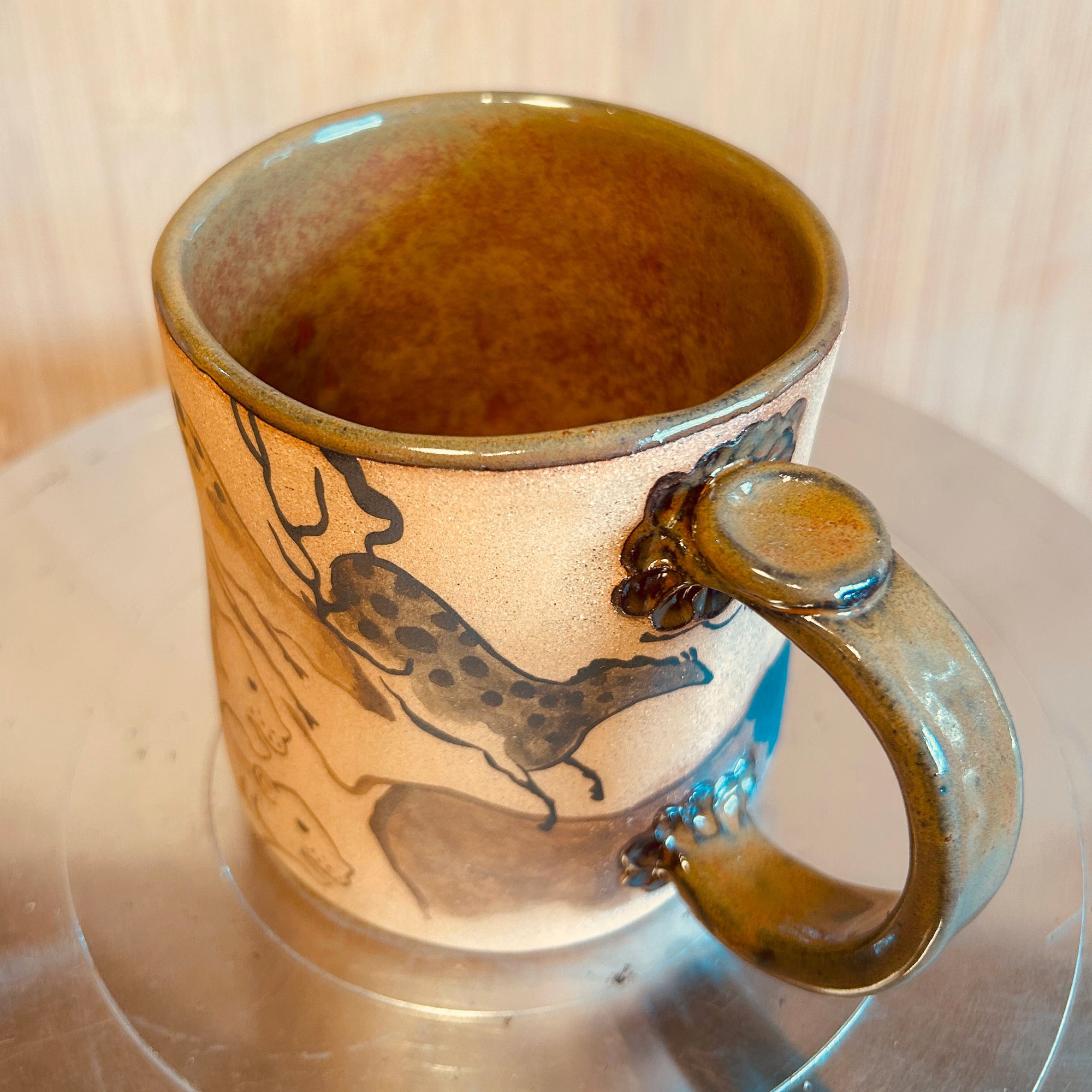 A mug inspired by European cave art. Made from brown speckle clay, the outside of the mug is unglazed (but it is fully vitrified and food-safe).