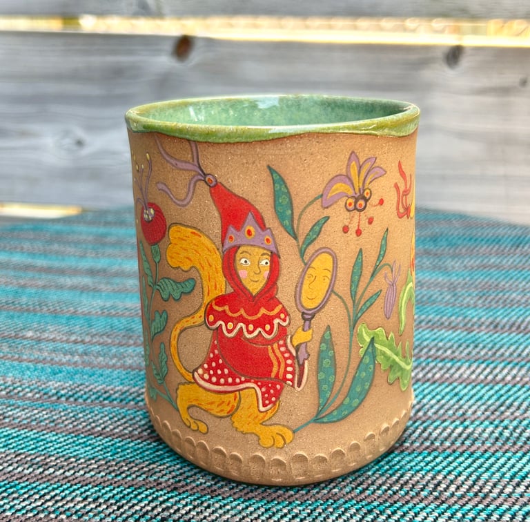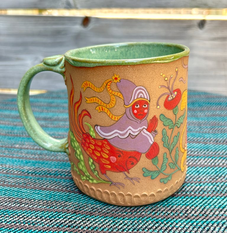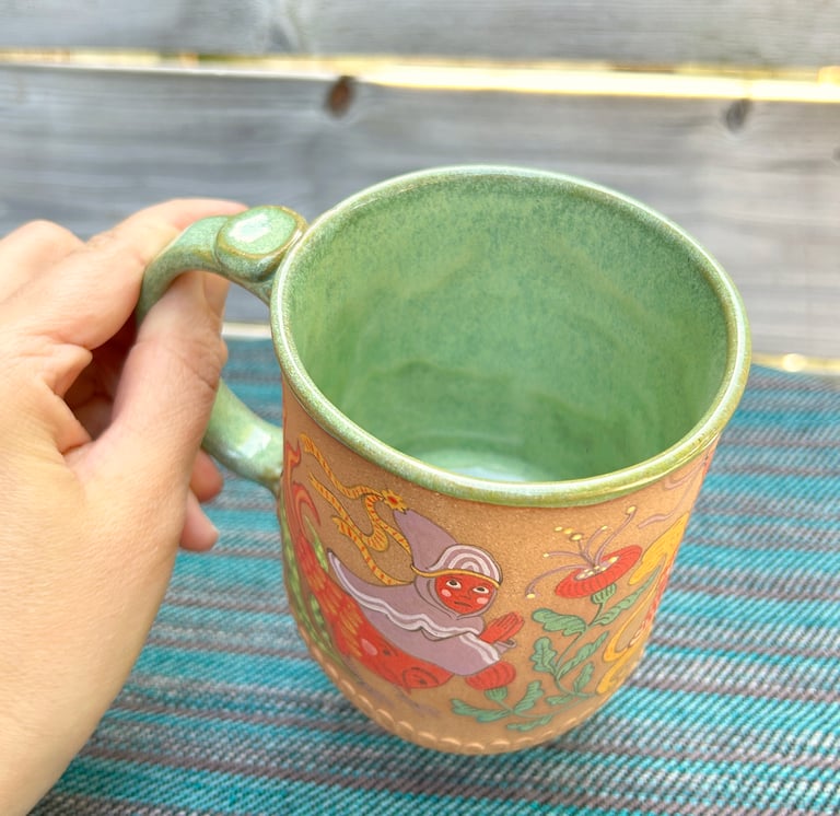A handbuilt mug made from brown speckle stoneware, inspired by the art of Medieval illuminated manuscripts. The mug is glazed on the inside and unglazed on the outside, giving the surface a feeling similar to smooth river-tumbled rock.