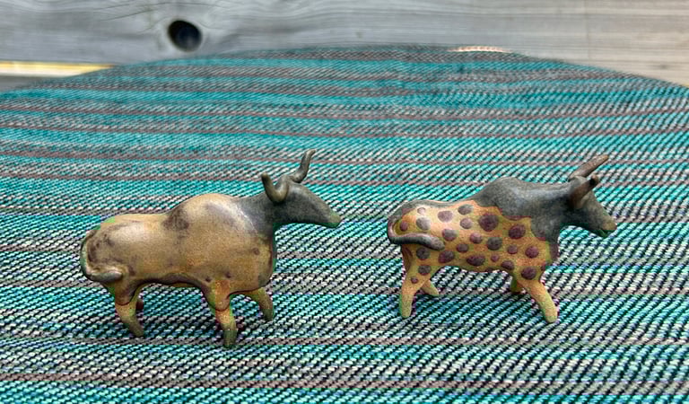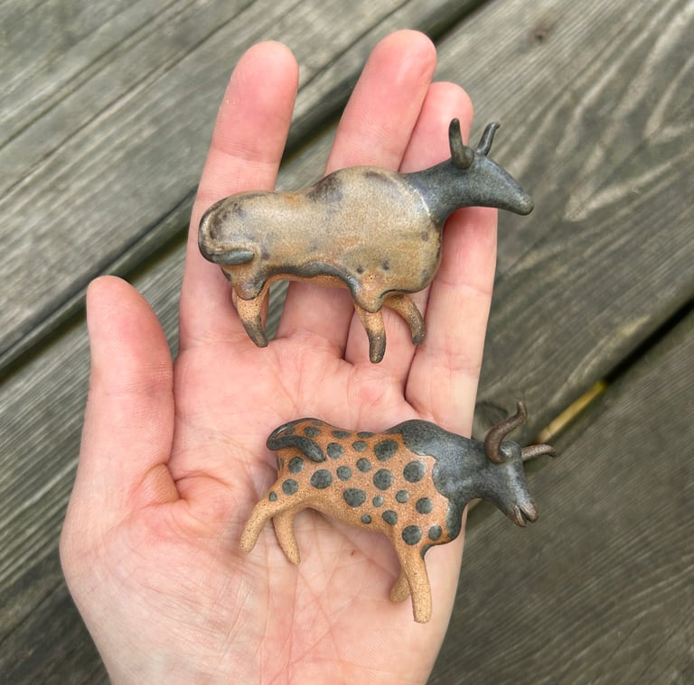Upon ordering, you will receive a mystery aurochs! All of the aurochses are approx. 5-6cm long, made from brown speckle stoneware, and glazed with an assortment of earth-toned glazes.